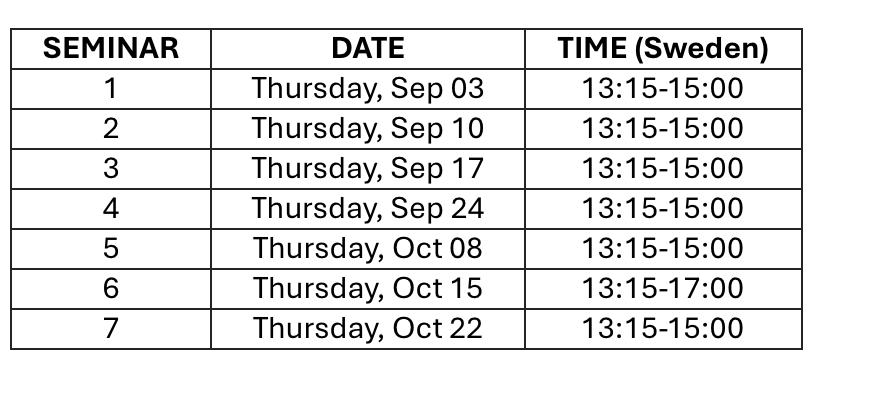 The course has 7,5 ECTS and it starts on September 3, 2026, and finishes on October 22, 2026, with deadline of the final assignment in November 2026. In total, there will be seven seminars. This is the schedule: